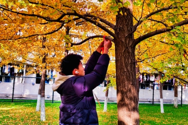 图2 参与者将红丝带挂在银杏树上