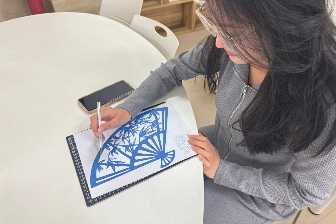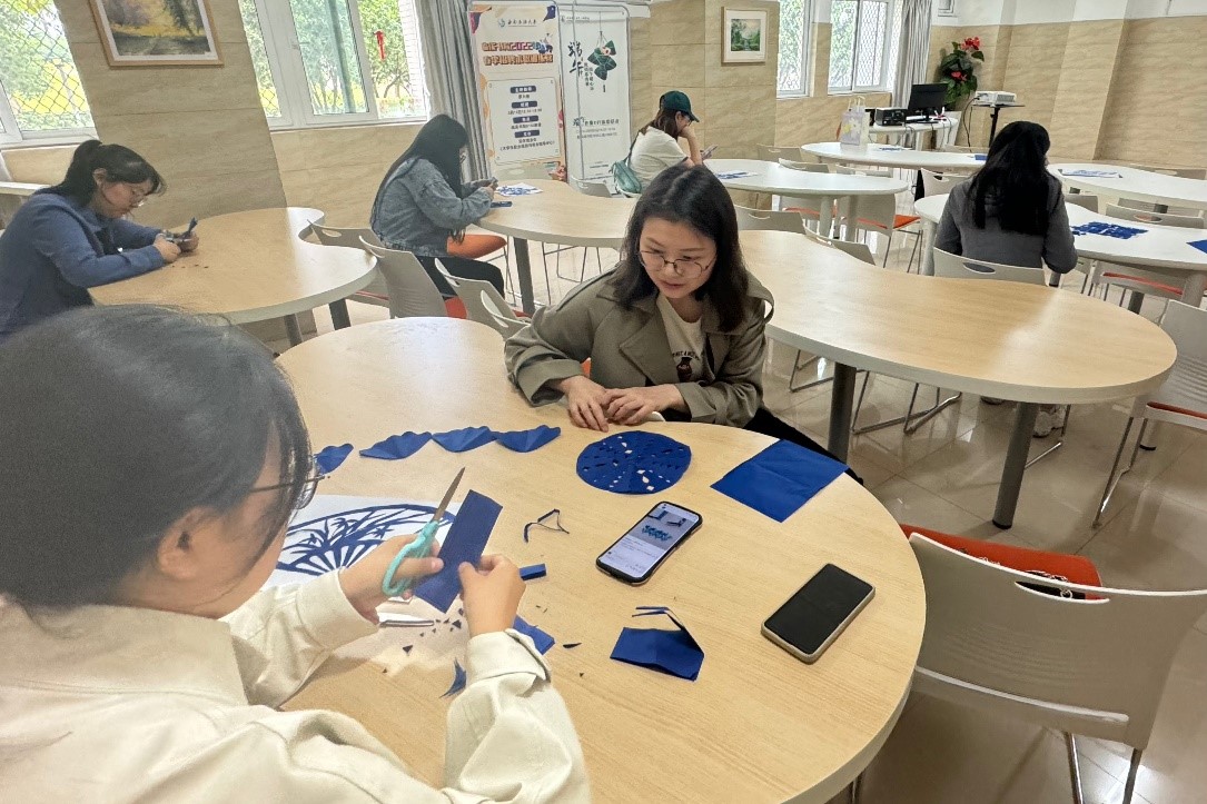 在剪纸活动中,同学们通过剪刀和特殊的刻刀将纸剪刻成各种花草图案,从清丽的花草中拓印出中式青花之美,以独特的视觉形象和造型艺术,展现出中国美学气韵。