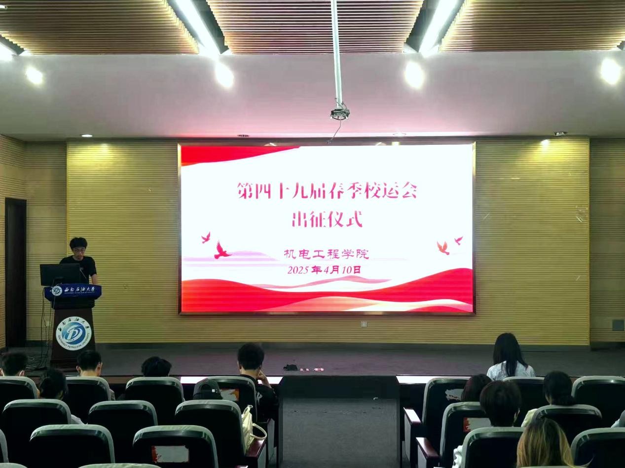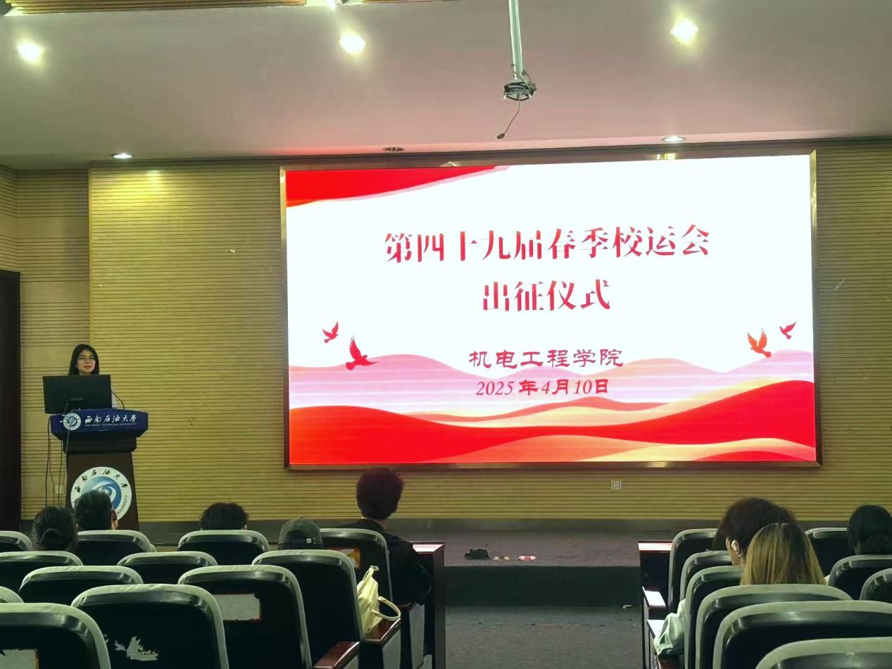 2025年4月10日,西南石油大学机电工程学院第四十九届春季校运会出征仪式在明志楼B105报告厅隆重举行。学院老师、学生代表及全体运动员齐聚一堂,共同见证这一充满激情与斗志的时刻。