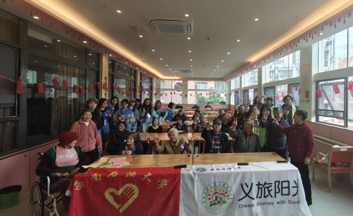 活动在主持人温暖的问候中拉开序幕。首个节目是由三位同学带来的合唱《外婆桥》,清澈的歌声唤起浓浓亲情;随后,三位志愿者深情演绎《感恩的心》,以手语传递敬意与谢意。紧接着,一段热情洋溢的拉丁独舞将现场气氛推向高潮,赢得老人们阵阵掌声。互动环节中,全体志愿者齐声合唱《桃花朵朵开》,轻快的旋律伴随欢声笑语,萦绕在整个活动现场。