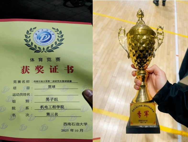 10 月底至 11 月,西南石油大学第二届研究生篮球赛在校园内圆满落幕。经过多轮激烈角逐,我院研究生篮球队凭借坚韧不拔的斗志、默契十足的团队协作与扎实的竞技实力,最终斩获男子组季军,为学院赢得荣誉的同时,充分展现了机电学子昂扬向上、敢打敢拼的精神风貌。