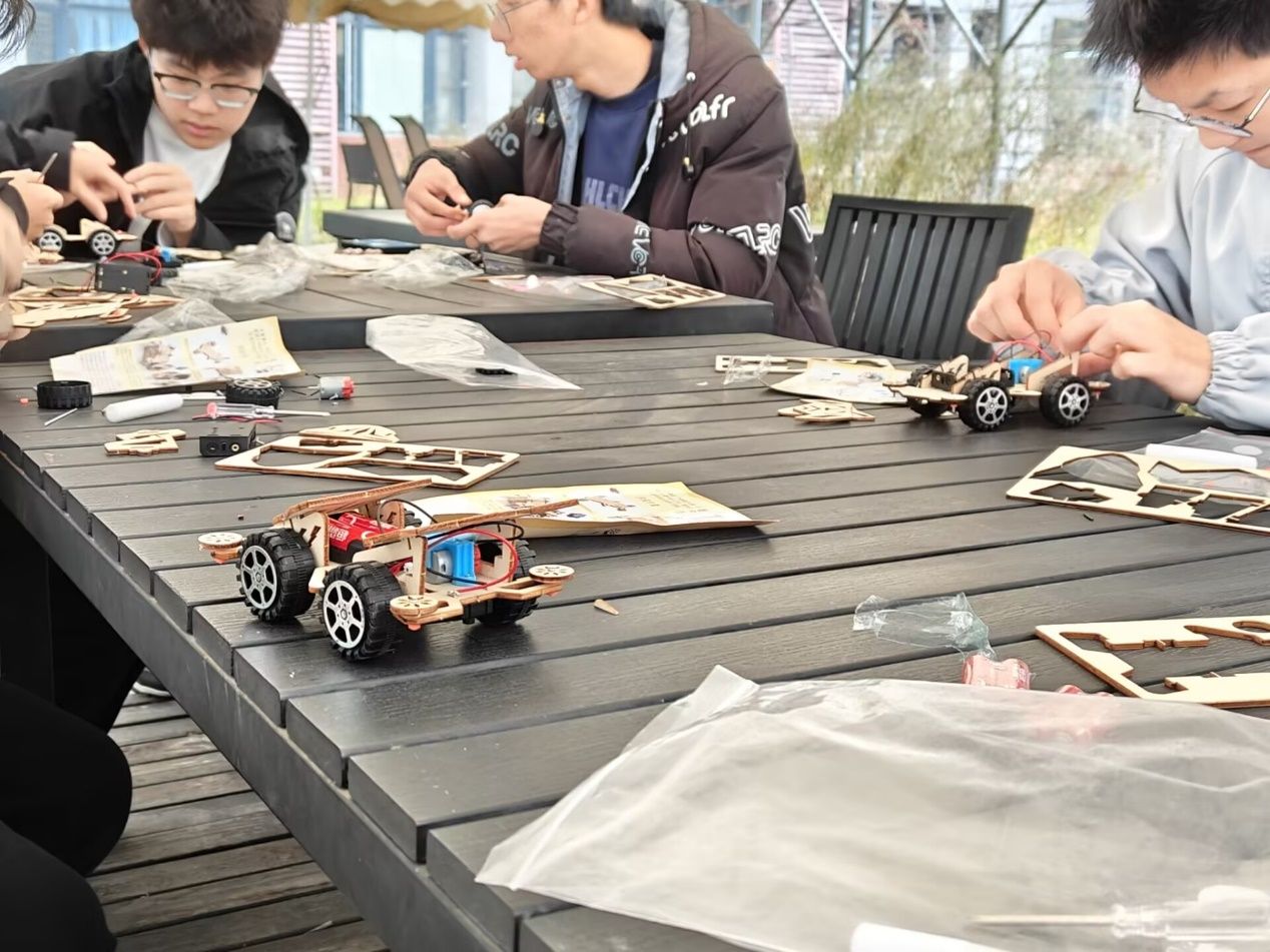 本次活动是一次连接课堂理论与实物操作的桥梁,同学们需要在理解基本机械原理与简单电路知识的基础上,完成从零件识别、结构组装、电路连接到整体调试的全过程。在动手实践环节,同学们迅速投入状态。桌面上摆满了马达、螺丝、车轮、底盘、电池盒以及各类工具。大家或专注研究图纸,或热烈讨论传动方案,或小心翼翼地进行拼装与紧固。当亲手组装的小车首次依靠自身动力前进时,现场充满了成功的喜悦与惊叹。