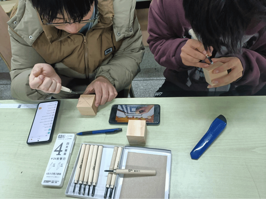 实践环节中,同学们纷纷化身“小匠人”,领取木料、刻刀等工具,开始专注创作。大家对照着参考图案,先在木料上用铅笔细细勾勒轮廓,再小心翼翼地拿起刻刀进行凿刻。过程中,有的同学因力度把握不准,不小心刻坏了图案,面露沮丧;有的同学则在老师的耐心指导下,逐渐找到技巧,雕琢的速度越来越快。从简单的几何纹样,到精巧的花鸟图案,一块块普通的木料,在同学们的指尖慢慢被赋予生命力。活动尾声,大家互相展示自己的作品,分享创作心得,现场洋溢着满满的成就感与幸福感。