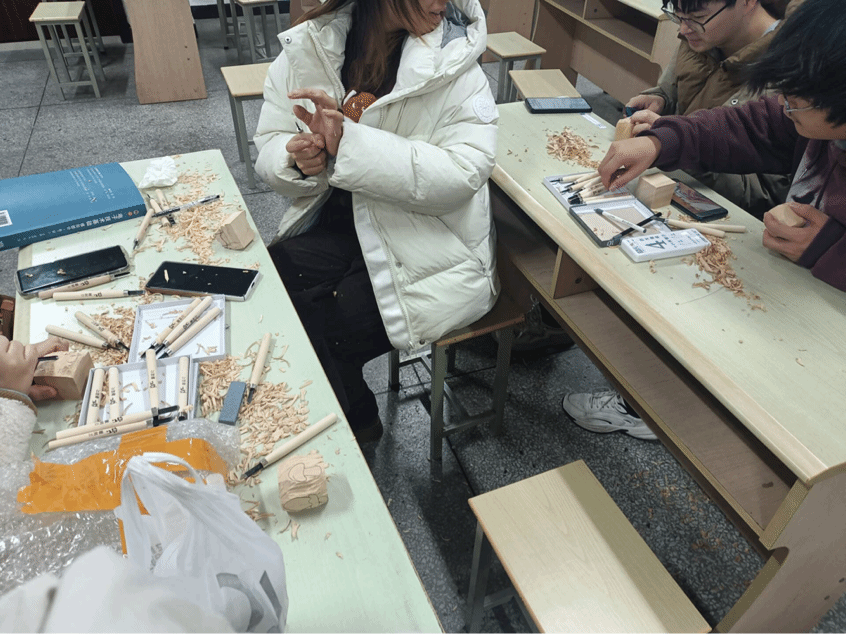 活动现场,暖意融融,木料的清香弥漫在空气中。在活动现场播放了关于传统木雕的记录片,向同学们介绍了木雕的历史渊源,从河姆渡遗址的木雕残件,到明清时期精美绝伦的木雕家具与建筑构件,一幅幅图片、一段段讲解,让同学们深刻领略到木雕工艺跨越千年的文化底蕴。随后,老师现场演示了木雕的基本技法,从木料的挑选、图案的勾勒,到刻刀的握法、凿刻的力度,每一个步骤都讲解得细致入微,手中的刻刀在木料上辗转腾挪,不一会儿,一朵栩栩如生的木兰花便初具雏形,引得同学们阵阵赞叹。