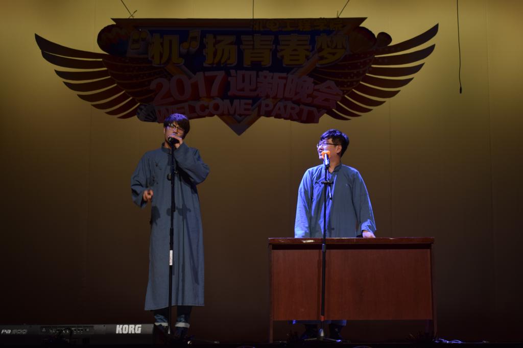 在首轮唱战后,迎来了今晚的首个语言节目,相声《我是歌手》。来自机械工程2016级的梁仕远同学和2016级机械设计的崔建晨,用他们诙谐的表演让现场的同学们忍俊不禁,赢得了大家的一致好评!