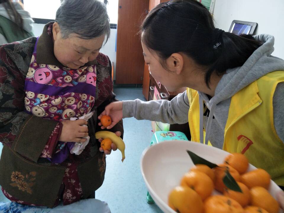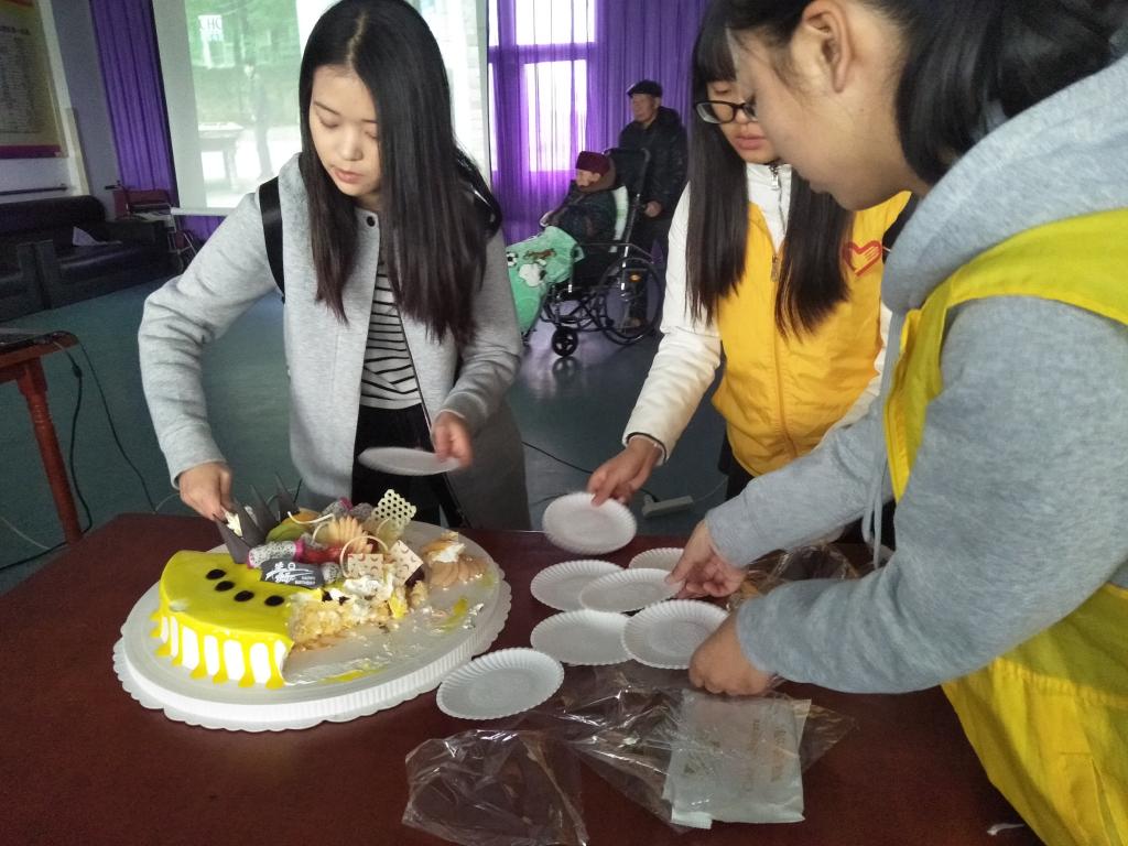 上午7::20,志愿者们便提着准备好的蛋糕、饺子皮、水果、投影仪等物品集合,经过接近一个小时的车程后到达新都香城颐养居。首先,志愿者对大厅进行打扫布置。在主持人的开场白之后,志愿者分成几个小组,到每个老人的房间邀请并搀扶他们下楼来观看暖心的纪录片。同时志愿者们分工明确,切蛋糕、洗水果,为老人们过集体生日。厨房里的志愿者忙于包饺子,为老人们准备午餐。大厅里的志愿者和老人们聊天、谈心,为他们剪指甲,整个敬老院其乐融融。