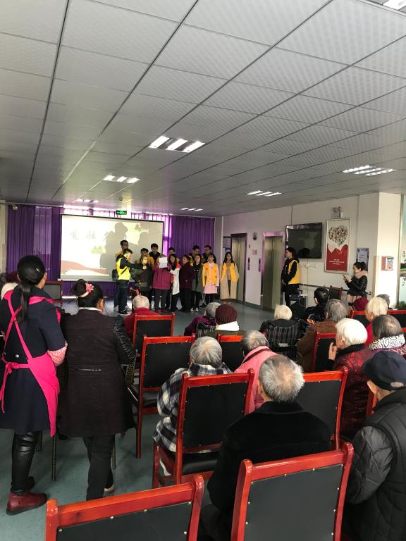 午休时间后,下午2:30,老人再次齐聚大厅,志愿者们开始展示精心准备已久的节目。节目形式多样,内容丰富。节目主要有合唱《国家》、小品、诗词朗诵、藏粤语结合版的《喜欢你》、金典歌曲演奏等。老人们也积极地参与其中,三位老人作为老石油工作者和新石大学子带来大合唱《我为祖国献石油》。下午大约17:00,活动接近尾声,志愿者和院长、老人们相互道别,并合影留念。