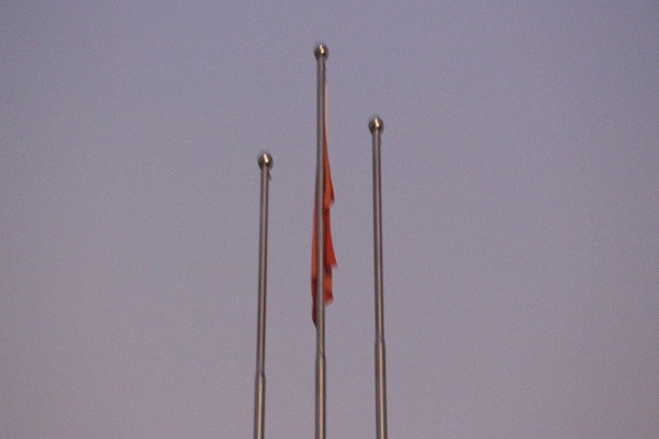 6:50分,升旗仪式正式开始。升旗仪式第一项——奏国歌升国旗。只见国旗护卫队踏着整齐的步伐,向国旗迈进。国旗随着音乐缓缓升起,同学们的目光交汇在国旗上,好似看到一个光明的前程。