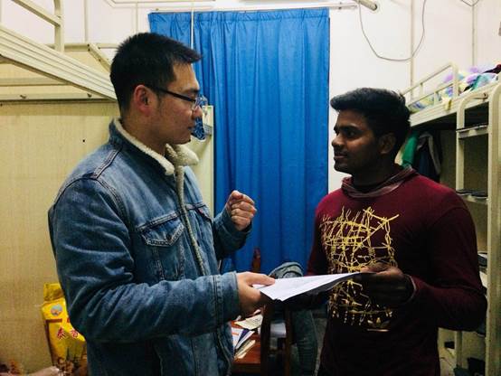 1月31日晚9:30,正值寒冬腊月,国际学生辅导员徐博到学生寝室,走访慰问留校国际学生,话春节,暖人心。