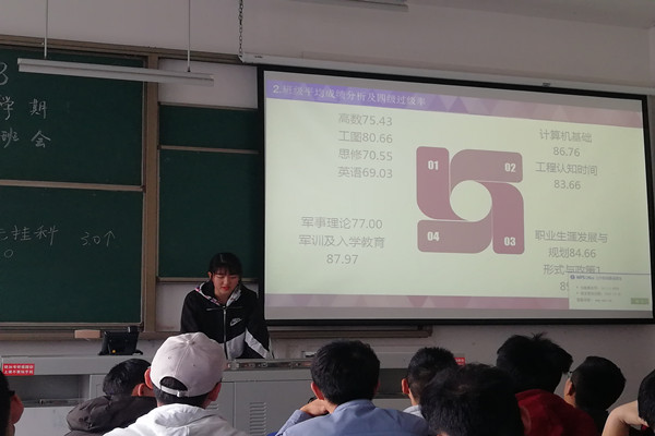 接下来进行的是班委述职,班长柳浩首先总结了第一学期班级学习状况和带领同学们参与的各类活动,提出部分同学不是注重学习,而是把心思放在了其他事情上,并表示新学期要继续加强学风建设,希望将班级平均学分绩点控制在3.0以上,班级建设方面要重新制定班规和各寝室的寝室公约,建议每位同学都提供几条意见以供筛选。学习委员周沫则是将班级各课平均成绩展示出来,分析不同学科对应的学习方法,并指出新学期要在保证高数英语工图等学分占比较重的学科外,还要加强对偏文科的学科的学习,带动班级中成绩优秀的同学帮助班级成绩较差的同学的学习,努力提高全班的平均绩点;新上任的生活委员唐成波同学也向同学们展示了自己的新学期规划,在设置男生女生寝室内务各自最低分数限制的同时,鼓励寝室间两两进行比赛,进行寝室平均绩点、寝室学习氛围和内务情况的比拼,全力配合班长搞好学风建设。其余班委的述职和新学期规划也得到了全班同学的认可。
