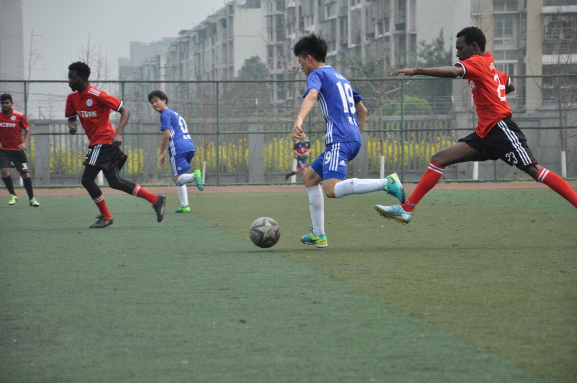绿茵点燃梦想,激情舞动青春。两场比赛在双方运动员的奋力拼搏之下,都给我们展现了一场视听盛宴。在留学生与大二学生近一个多小时的比赛中,双方队员更是激情四射,围绕一颗球展开了猛烈的抢攻。比赛开始后,在双方球队队员的加油打气声中,队员们很快进入了状态,场上不论是穿红色队服的留学生的队员们的展开的凌厉攻势,还是穿蓝色球服的大二的球员的细腻脚法与巧妙配合,都让人感慨万分,自叹不如。在比赛中,双方队员都大汗淋漓,但没有一个人说累,都拼到了精疲力竭。在比赛中,双方队员都在运动中释放了自我,拼搏中展现了激情,相信这次比赛会激励他们在学习生活方面继续,取得更优秀的成绩。