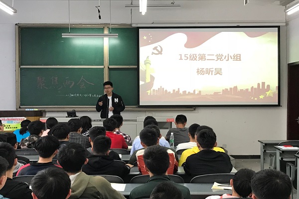 团组织生活伊始,主持人文逸飞讲述了两会的概况,并深刻解读了两会的十二句寄语,即为未来奋斗,把蓝图变成现实,贯彻社会主义思想,扫除一切腐败。通过观看两会视频,每位团员和党员更加深刻的理解了两会的精神,也更加清楚自己的历史使命。团组织生活期间,第三党支部的徐嘉豪,任安平,陈志,杨昕昊四位学长就“爱国,奋进,就业,教育,生活,学习”六个方面阐明了的看法。其中15级第二党小组的杨昕昊学长围绕学习生活,指出大学生应当在大学学会自我成长,时间管理,制定目标,注重效率;为此杨学长专门举了室友学习英语的例子,告诫学弟学妹珍惜时间,不负昭华。最后过控大一班的辅导员喻瑜老师上台做总结,并提出“精准扶困”的观点,及重点帮助学习生活有困难的同学,形成友善的班级氛围,积极响应社会主义核心价值观。
