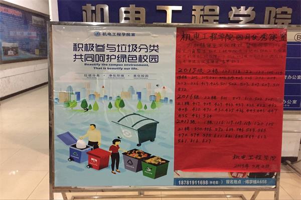 为响应十九大“加强生态环境保护,建设美丽中国”的号召,近日,机电工程学院组织开展了推进生活垃圾分类的宣讲活动。旨在提升学生垃圾分类意识和形成良好的舆论氛围。