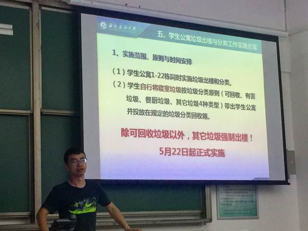 2018年5月17日,辅导员夏天鸿老师在明德楼2017级工业设计自习室,召开了“学生公寓生活垃圾出楼与分类”的主题宣传班会。