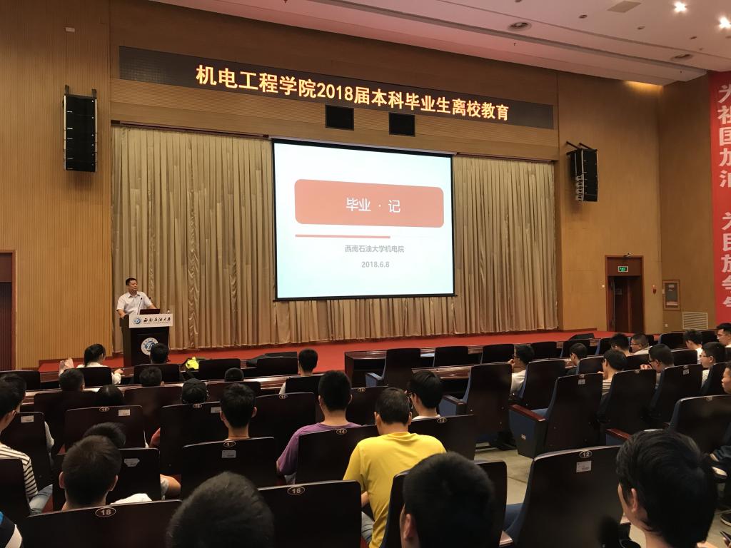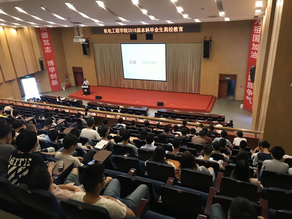 为确保我院2018届毕业生安全、文明离校,6月8日下午4点20分,机电工程学院在图书馆报告厅组织召开了2018届本科毕业生离校教育会议。学院党委副书记姚伟宁出席会议并讲话,各毕业班辅导员及全体大四学生参加会议。