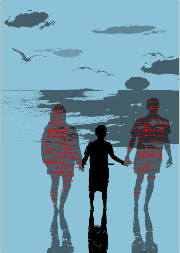 作品灵感来源于现在很多家长都忙于工作,很多孩子的成长的缺失父母的陪伴。本设计中间是一个孩子在海边的剪影,左右手牵着文字云构成的父母,象征着孩子渴望父爱母爱,渴望家庭的温暖。远处的大海日出象征着成长。传达了号召父母多关注自己孩子的成长,不要让孩子在成长道路上缺失了爱。