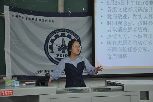 中国研究生石油装备设计大赛旨在于提高中国研究生的创新能力,加强各石油高校之间的联系,对于各大石油院校来说,是极为十分重要的比赛。此次赛事我校作为主办方,更是可以以此为契机,展现出我校的精神风貌。面对如此重要的活动,志愿活动在比赛是必不可缺的,志愿者培训的举办更是对赛事的顺利举行具有积极的意义。