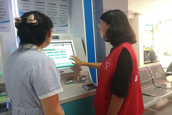 每天的早八点到九点半,下午两点到三点是医院的挂号高峰期,不仅挂号窗口排起了长廊,就连自助终端机处也挤满了人。自助终端机是一种新兴的服务机器,可以无需服务人员就能完成挂号,缴费,办理就诊卡等操作,可以说是大大便利了患者。不过方便的同时也存在问题:许多患者年龄比较大,对于机器的操作不够明白,会大大延长占用终端机的时间。医院就诊大厅只有两个自助终端机服务人员,耐心地给使用者们一步步讲解操作,不过这显然无法满足庞大的人流量,医务人员们虽然忙的不可开交却也无可奈何。