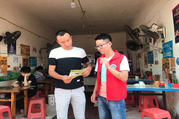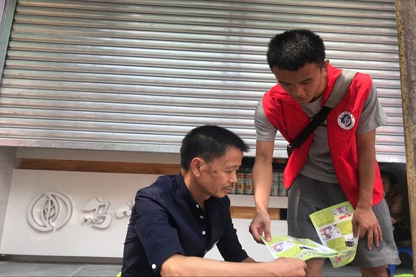 队伍的第二站是与学校相邻的小吃街,此时正值正午时分,街道上人流量较大,对于队伍的宣传讲解十分有利。队员们分成两个小队,在各个街道上进行宣传讲解,随后又进入商家店铺,向老板和顾客进行禁毒防艾的知识的普及,并发放禁毒防艾的物资。正因街作为人流汇聚较大的场所,对于禁毒防艾的宣传力度更应增强,在这里进行禁毒和防艾的宣传,不但满足其必要性,而且宣传的目的更加明确,效果更加好。在队员耐心的讲解下,小街里的 人对于禁毒防艾的认识也都大大提高。