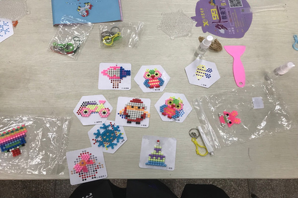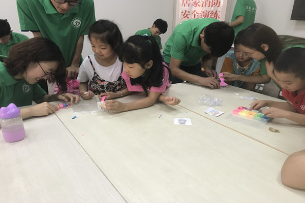 孩子们在队员的帮助之下完成自己的创意水溶豆作品