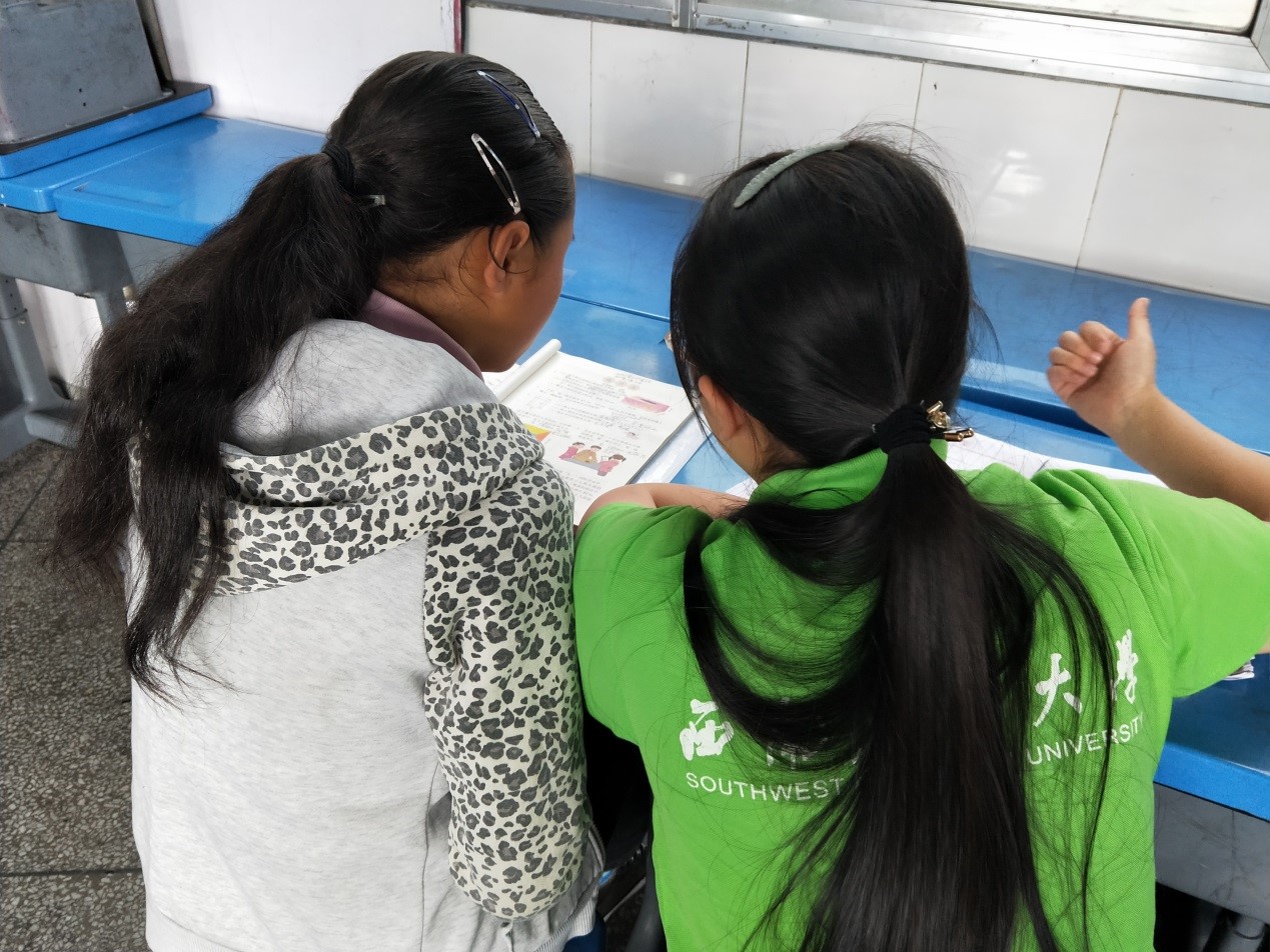 在前期的实践调研中,大家得知当地教学资源匮乏,孩子们的学习途径有限。实践队决定在自己力所能及的范围内最大程度地帮助他们。在准备阶段,大家计划进行集体辅导,但由于小朋友年龄跨度较大,组织集体学习的开展还是有一定的难度。因此实践队员根据实际情况调整策略,采取一对二的辅导模式。虽然在前几日的相处中,实践队员和他们已经建立起了良好的关系,但在面对学习问题时他们还是比较害羞,不敢主动问问题。于是队员们采取循序渐进的方法来引导小朋友们发现问题、提出问题并解决问题,并且尝试教会他们从多种角度思考问题、灵活运用所学过的知识来解决问题。此方法初具成果,渐渐地教室里的学习氛围浓厚起来,小朋友们也逐渐活跃起来,他们的学习兴趣也被调动了起来。