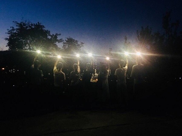 傍晚,气温居高不下,团队成员穿过乡间小路,踏过高速路天桥,爬上山坡,登上石阶,终于在一小时后来到了位于半山腰的观景台,大家打开了手机电筒的灯光拍了合照,好似夜空中最亮的星星。
