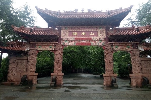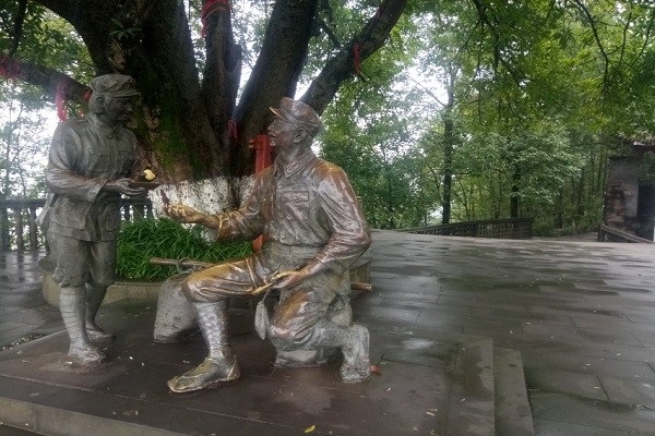 相传龙角山有着红军的足迹,我们来到龙角山山脚,沿着幽秘的青石石阶踏上龙角山,可惜天公不作美,下着毛毛细雨,还有些许微风,不过这烟雨仿佛为龙角山披上一层薄纱。很快我们一行人来到半山腰,这里有座半山亭,据说这里是红军劳作中途休息的地方,我们也在这儿稍作,感受红色精神。我们继续上路,又是一段石阶路,石阶旁边有着许多的描述蓬安特色景物的诗词,有着强烈的人文气息,让我们不停驻足。我们步伐很慢但也即将到达目的地——红军树,我们带着朝圣般的激动心情继续向上,我们总于见到了红军树,一株3人合包才能抱住,十多米高的大树,相传这是由红军亲自栽种,大树上有着许多的的红丝带,寄存着人们的美好希望,大树旁边还有一个红军老战士和小战士的铜刻雕像,我们在此合影留恋,亦感受到红色的印记和浓烈的红军气息。