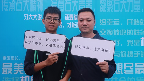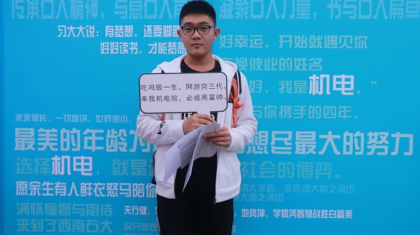 机电院的新生们在背景墙前留下了自己灿烂的微笑,墙上的个性标语展现了石大和机电学子的新面貌。“传承石大精神,写意石大青春,凝聚石大力量,书写石大篇章”展现了西南石油大学的风采;“大一上学期,立个flag,绩点上个四,综测得前五,进个学生会,竞赛得个奖,找个小对象,生活美滋滋”道出了新生在大一的奋斗目标;“最美的年龄为最纯的梦想尽最大的努力”则表现出对新生的激励与鼓舞;“天行健,学长以实力打倒高富帅;地势坤,学姐凭智慧战胜白富美”向新生们宣示努力与智慧所创造的奇迹;“未来很长,一切难讲,世界很小,来日方长”则预示着未来有无限的可能……