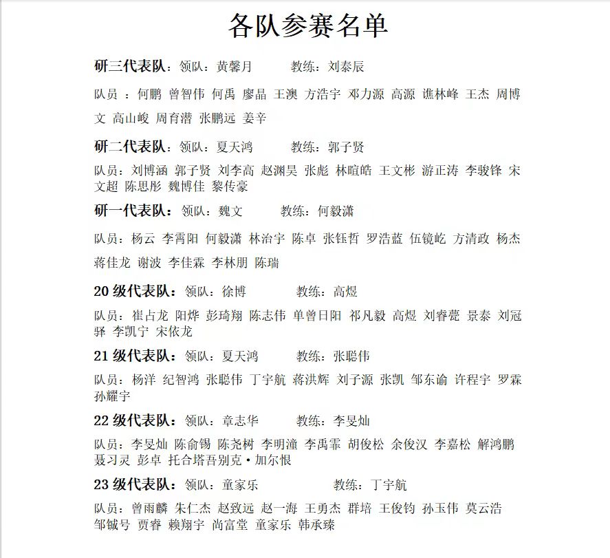 2、各队以机电院专业或年级为单位报名,需报领队和教练员各一名,参赛队员15名,各队参赛队员必须为本专业或年级学生。