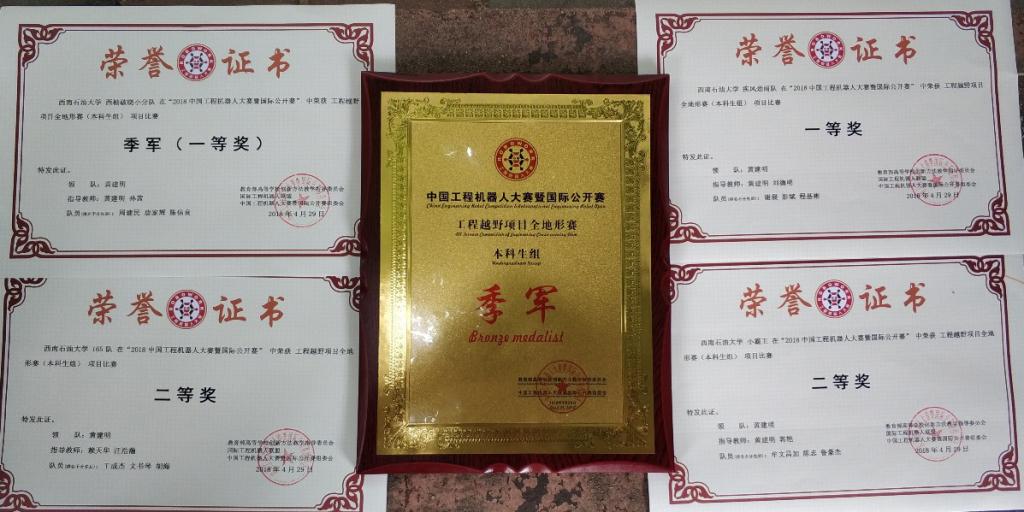 4月26日至29日,2018中国工程机器人大赛暨国际公开赛在武汉中国地质大学举行,来自我院的多名同学代表学校参加了工程越野项目全地形赛的比拼,取得了两项全国一等奖(其中一项全国季军),两项全国二等奖的好成绩,创我校在该赛事上的历史最好战绩。