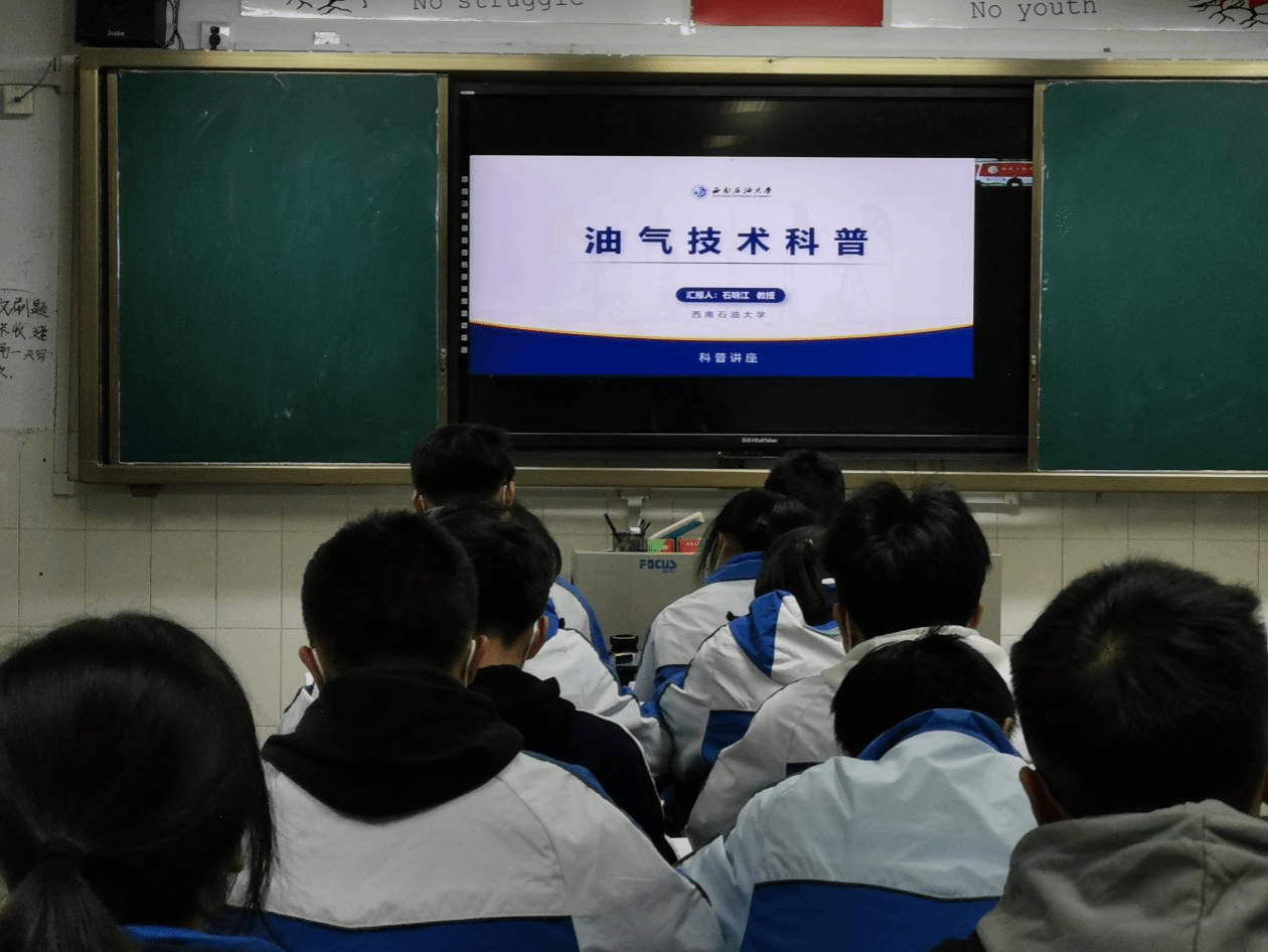 各中学对西南石油大学代表的到访表示欢迎,对西南石油大学的教学、师资给予了充分的肯定。座谈交流中,双方围绕高中学生的生涯指导、高考改革、招生政策、研学活动等话题开展了热烈的讨论。我校代表向中学介绍了我校的办学历史、办学特色及学科专业建设情况,并向中学长期向我校输送优质生源表示感谢。科普讲座中,各位教师结合自己的科研经历,让同学们知道,纵使西方国家对中国实行封锁,但以西南石油大学师生为代表的的石油人不懈努力,突破重围,掌握了油气方面的核心技术,以此勉励同学们一定要有目标有担当,不辱使命,做一名合格的社会主义建设者和可靠接班人。