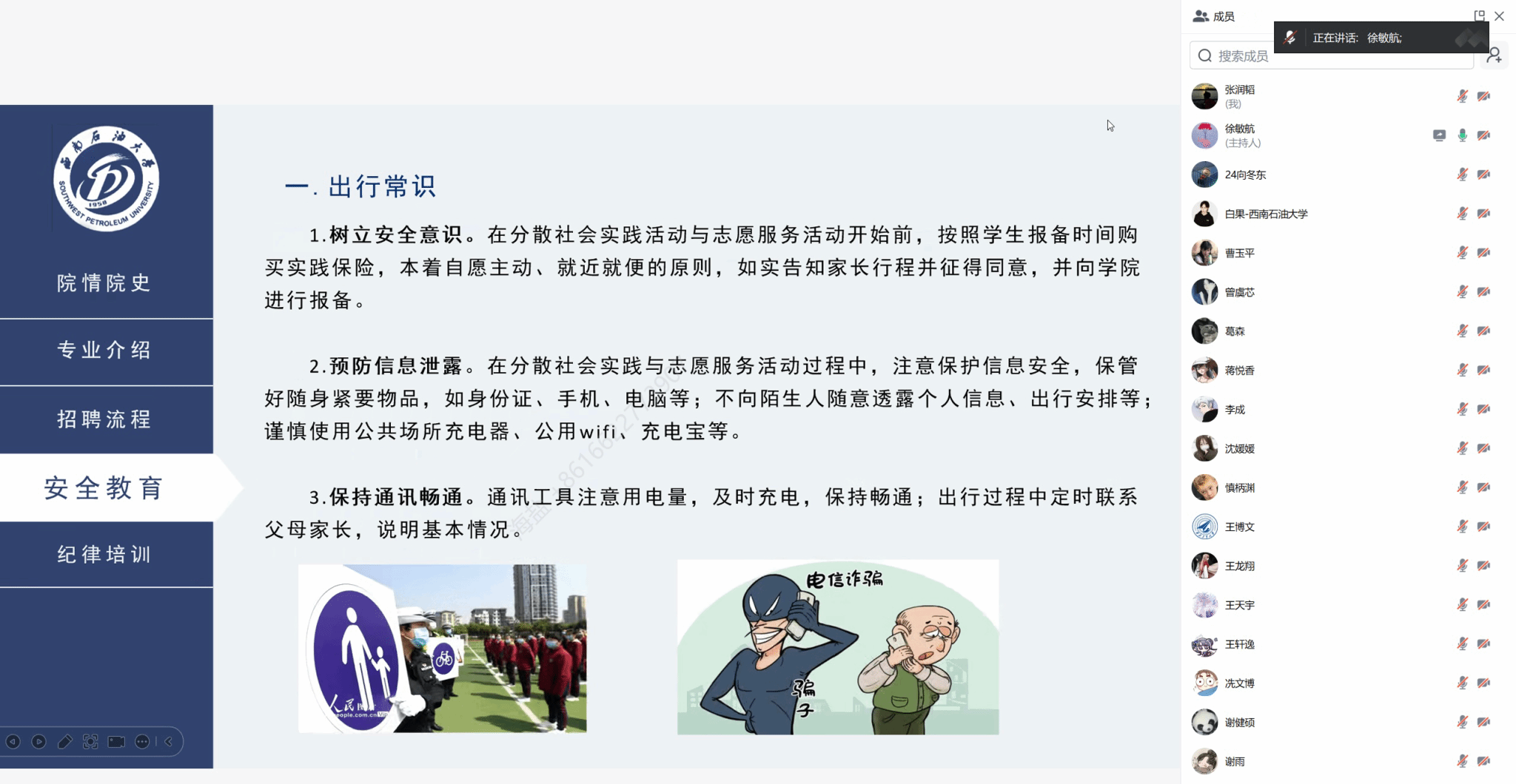 培训内容紧扣活动实际需求,涵盖活动背景、学校与学院发展概况、专业特色与成果、校园招聘流程、安全防护规范及宣传工作实务等多个方面。徐敏航老师重点介绍了2026届毕业生整体情况、校园招聘的主要类型与报名流程,并围绕实践活动的安全保障、队伍纪律等关键环节作了详细说明。