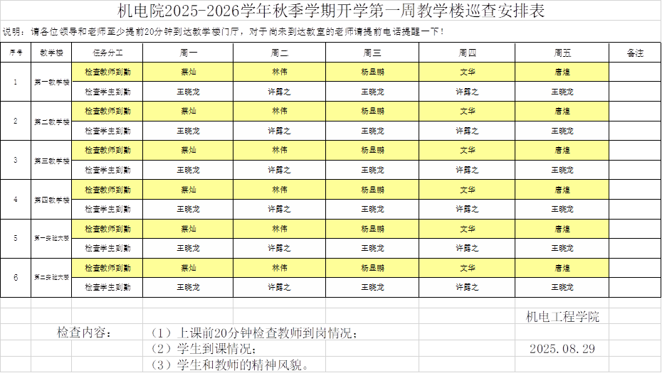 五、制定第一周教学巡视计划。根据学院开课课表,组成由学院院长牵头,学院领导、教学办公室及院长助理、学院学生工作办公室组成巡查小组,完成第一周所有课程的教学巡查工作,发现问题及时处理,保证教学工作正常运行。
