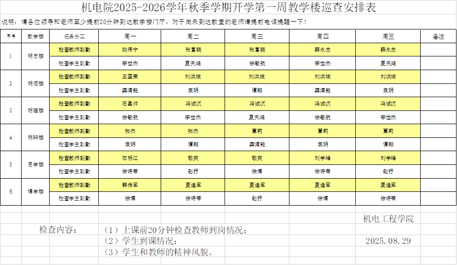 根据“关于做好2025年秋季学期开学教学准备及检查工作的通知(教务字〔2025〕101号) ”精神,确保9月1日正式行课及开学第一周教学秩序的良好运转,学院成立了以韩传军院长为组长的开学教学准备及检查工作小组,具体教学准备及检查工作及要求如下: