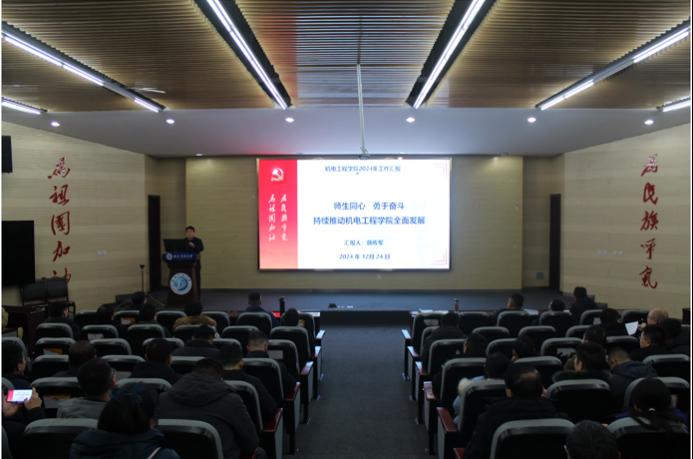 会议第二阶段,学院院长韩传军代表学院领导班子对机电工程学院2024年年度情况向全院教职工和学生代表进行了汇报。韩传军院长以“师生同心,勇于奋斗,持续推动机电工程学院全面发展“为主题,从党建、教学、科研、师资队伍、人才培养、学科竞赛、实验室等方面进行了汇报和总结,他指出过去一年学院的各项工作取得了长足进步,多个方面取得了新的突破,他明确了未来学院工作方向与重点,希望全体教职工凝心聚力,砥砺奋进,完成学校下发的各项任务,助力学院和学校高质量发展。同时,他也指出了目前学院存在的不足,希望学院各单位在2025年进一步加强协作,共同补齐短板。