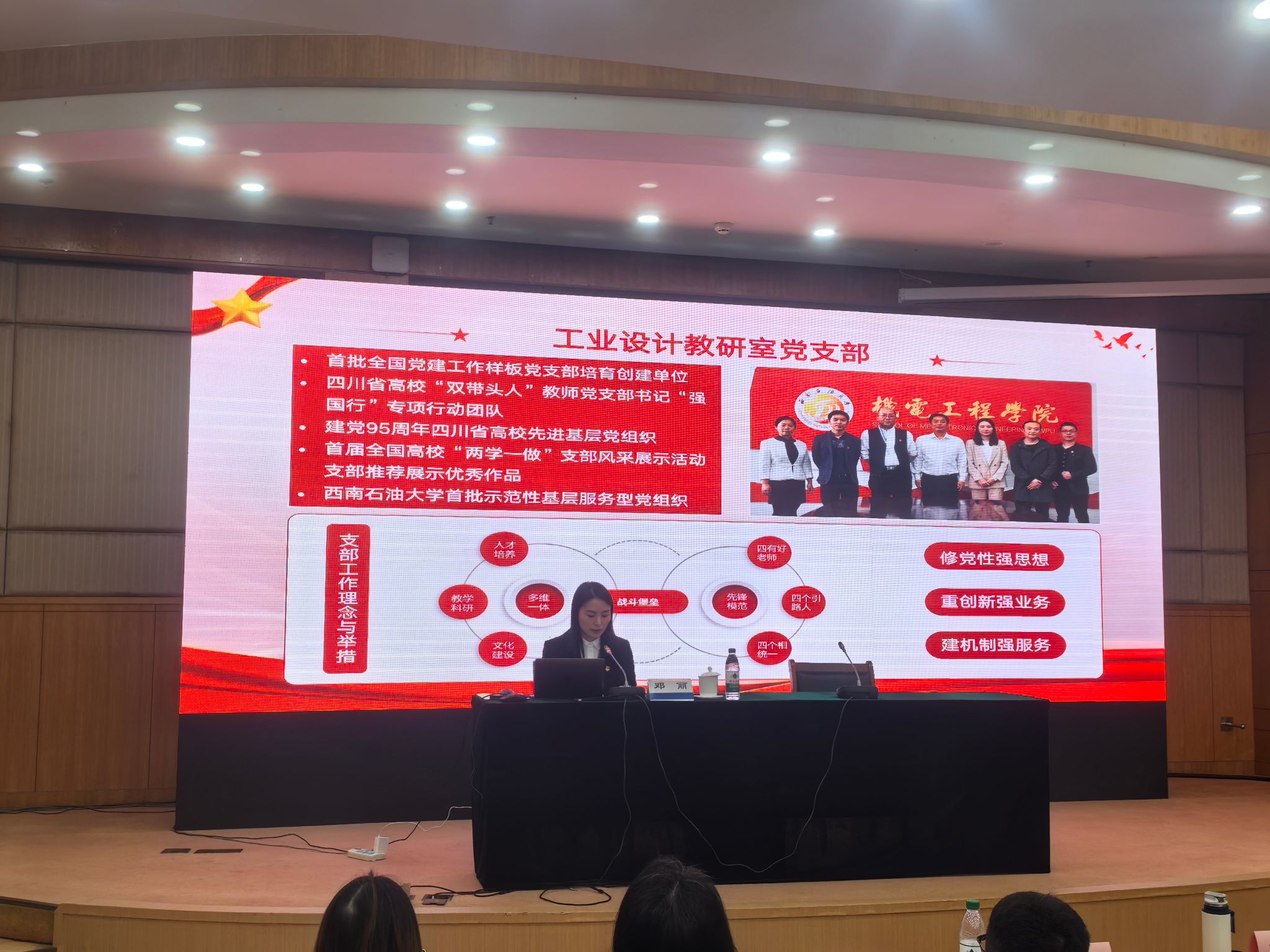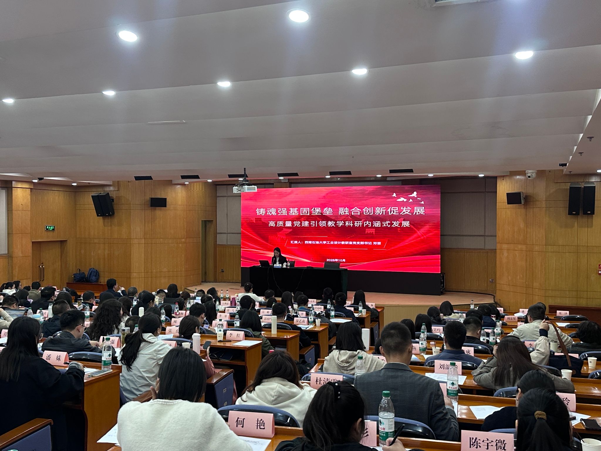 西南石油大学作为三所获邀作经验交流的高校代表之一,由机电工程学院工业设计教研室党支部书记邓丽以《铸魂强基固堡垒 融合创新促发展》为题作专题发言,分享党支部在推动党建与教学科研深度融合发展方面的创新实践与显著成效。邓丽从“新时代高校基层党支部的使命与挑战”“党建+工作法的探索与实践”“党建与教学科研深度融合的收获”三个方面,系统阐述了工业设计教研室党支部党建引领、教学科研融合、服务师生等方面的典型经验与创新模式,展现了我校基层党建工作的示范引领作用。