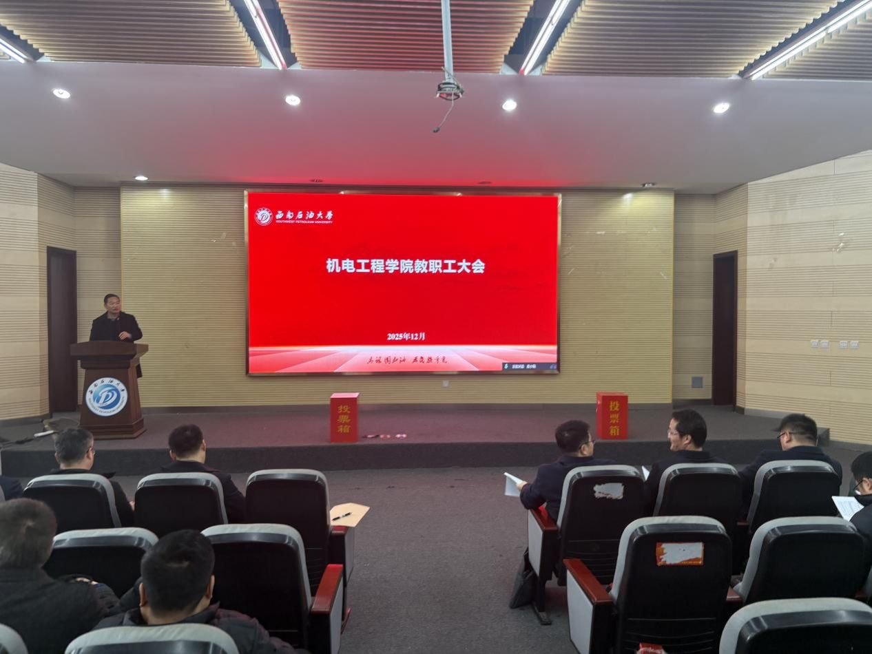 12月26日下午,机电工程学院在明志楼B105举行2025年秋季学期教职工大会暨处级领导干部述职测评,学院成都和南充两院区全体教职工及20名学生代表参加了会议,会议由院党委书记石明江主持,分为两个阶段进行。