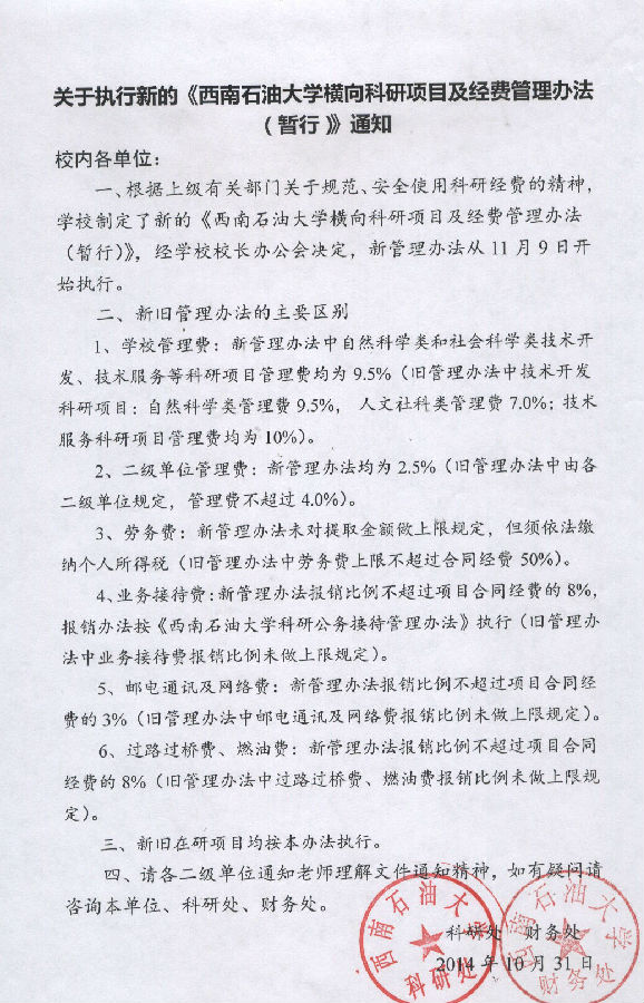 关于执行新的《西南石油大学横向科研项目及经费管理办法(暂行)》的通知