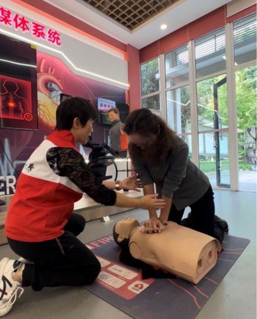 在基地工作人员、校医院郑伟蓉老师的带领下,大家参观了红十字基地的展厅和培训演练室。郑老师详细介绍了红十字运动的发展历程、主要职责以及近年来在应急救援、人道救助和志愿服务等方面取得的显著成绩,使我们深刻了解了红十字精神。参观结束后,开展了心肺复苏术(CPR)、AED的使用及海姆利克急救法等常用应急救护技能培训。郑老师以详细的讲解、直观的演示和生动的案例,充分激发了大家的学习兴趣,极大提升了学习成效。