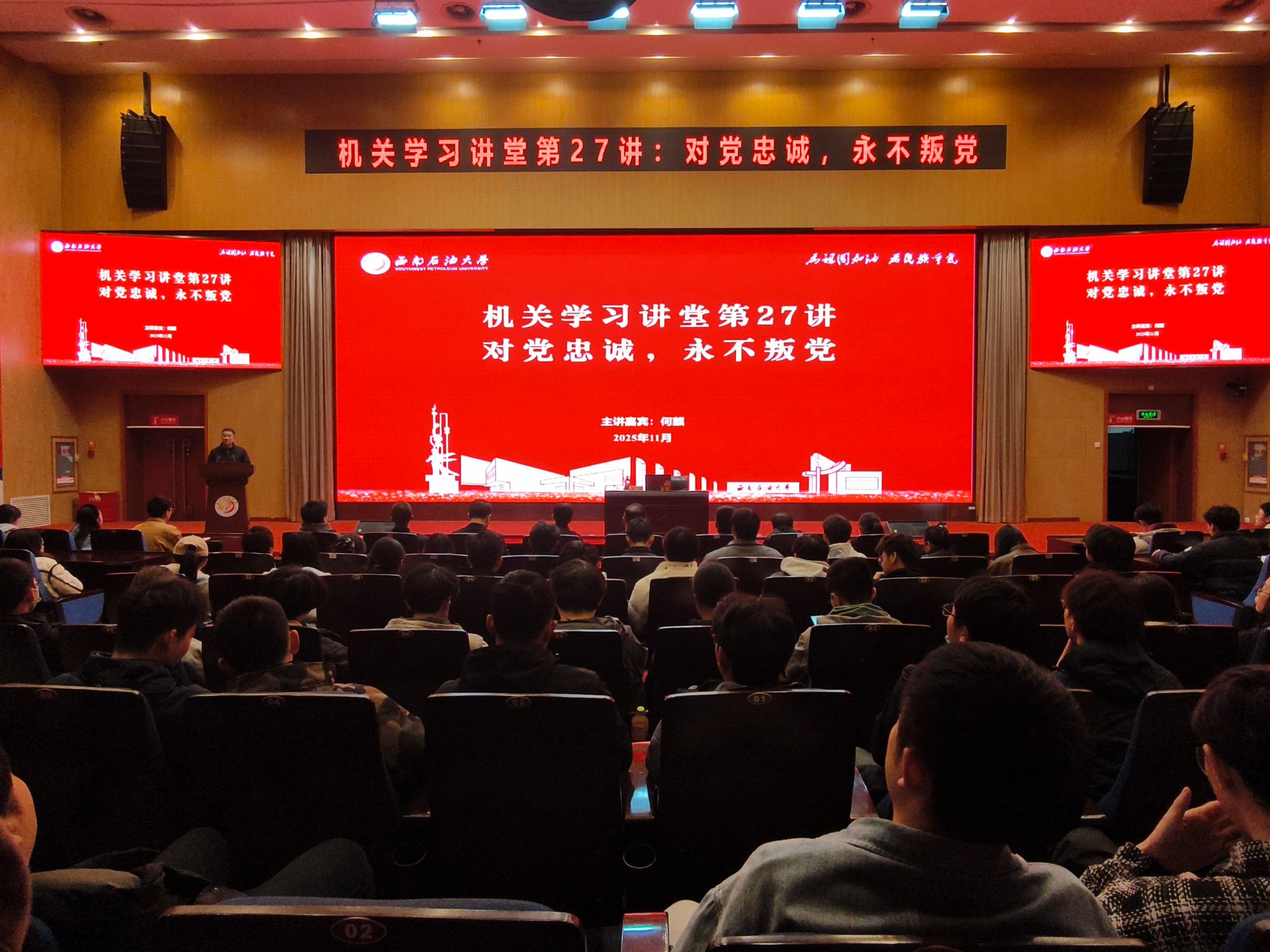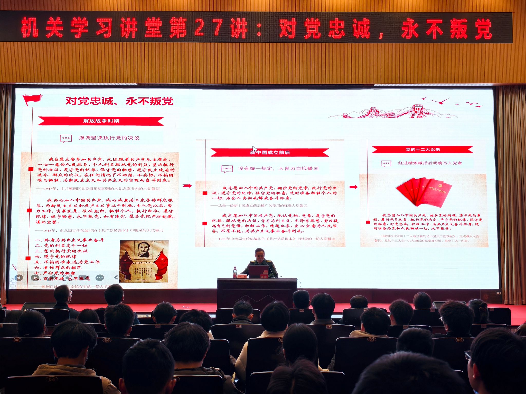 为筑牢信仰根基,锤炼党性修养,11月20日下午,“机关大讲堂”第27讲在图书馆学术报告厅举行。新都区委常委、区人民武装部政委何麒上校作题为“对党忠诚,永不叛党”的辅导报告。机关党委各党支部党员代表,机电院、化工院学生党员及入党积极分子参加了学习。报告会由校党委人民武装部部长戴志主持,校党建办主任、组织部副部长、机关党委书记张凤致欢迎辞。