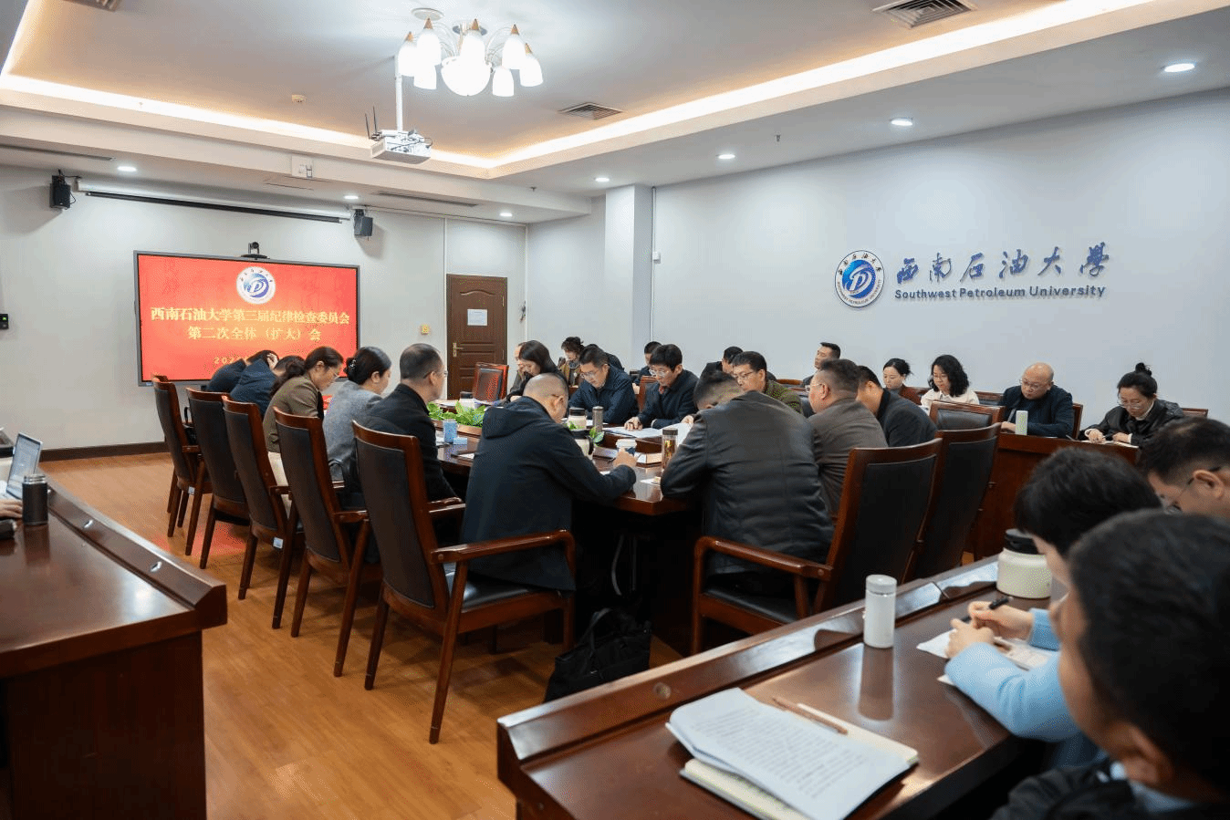 3 月 13 日上午,中国共产党西南石油大学第三届纪律检查委员会第二次全体(扩大)会议在办公楼 208 召开。驻校纪检监察组组长、校党委副书记、纪委书记张明主持会议并讲话。