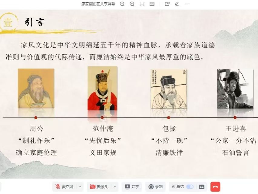 着眼当代,廖家熙重点分享了铁人王进喜及其家族廉洁自律的事迹,深入探讨值得我们借鉴学习的廉洁精神,比如公家的东西一丝一毫都不侵占、坚决拒绝为家人谋取私利等,充分展现了优良家风的传承与深远影响。
