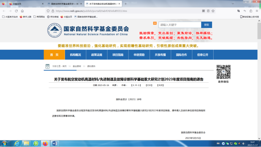 国家自然科学基金委员会现发布航空发动机高温材料/先进制造及故障诊断科学基础重大研究计划2023年度项目指南,请申请人及依托单位按项目指南所述要求和注意事项申请。