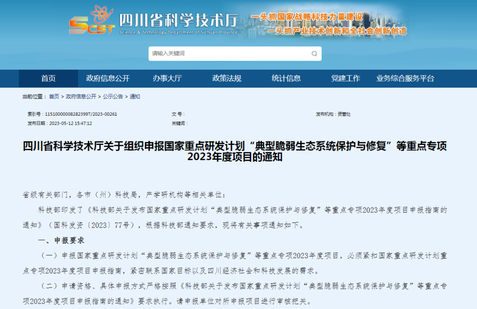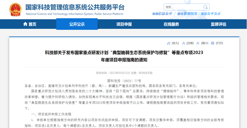 科技部印发了《科技部关于发布国家重点研发计划“典型脆弱生态系统保护与修复”等重点专项2023年度项目申报指南的通知》(国科发资〔2023〕77号),根据科技部通知要求,现将有关事项通知如下。