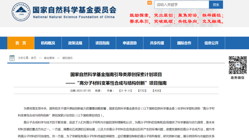 为贯彻落实党中央、国务院关于提升原始创新能力的重要战略部署,国家自然科学基金委员会(以下简称自然科学基金委)化学科学部拟资助“高分子材料变革性合成与结构创新”原创探索计划项目(以下简称原创项目)。