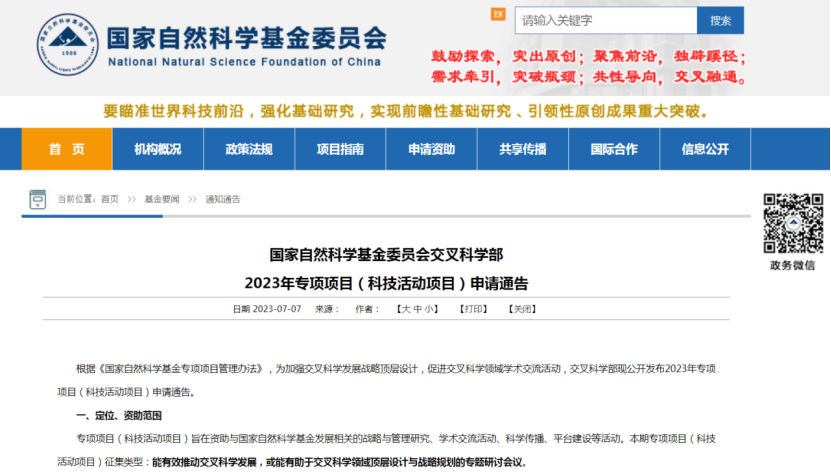 根据《国家自然科学基金专项项目管理办法》,为加强交叉科学发展战略顶层设计,促进交叉科学领域学术交流活动,交叉科学部现公开发布2023年专项项目(科技活动项目)申请通告。
