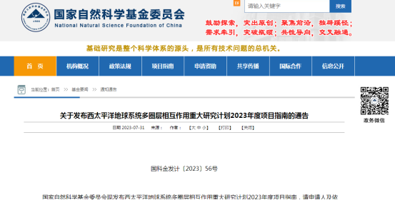 国家自然科学基金委员会现发布西太平洋地球系统多圈层相互作用重大研究计划2023年度项目指南,请申请人及依托单位按项目指南所述要求和注意事项申请。
