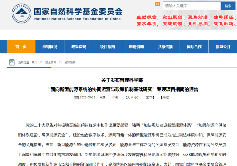 关于发布管理科学部“面向新型能源系统的协同运营与政策机制基础研究”专项项目指南的通告