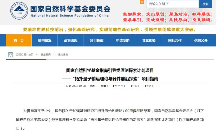 为贯彻落实党中央、国务院关于加强基础研究和提升原始创新能力的重要战略部署,国家自然科学基金委员会(以下简称自然科学基金委)数学物理科学部拟资助“拓扑量子输运理论与器件前沿探索”原创探索计划项目(以下简称原创项目)。