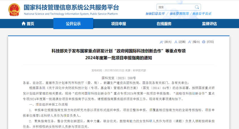 科技部印发了《科技部关于发布国家重点研发计划“政府间国际科技创新合作”等重点专项2024年度第一批项目申报指南的通知》(国科发资〔2023〕200号),根据科技部的通知要求,现将有关事项通知如下。